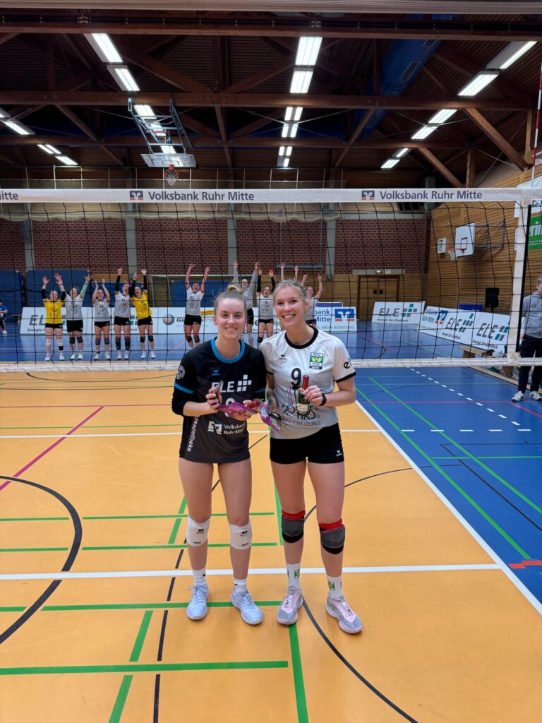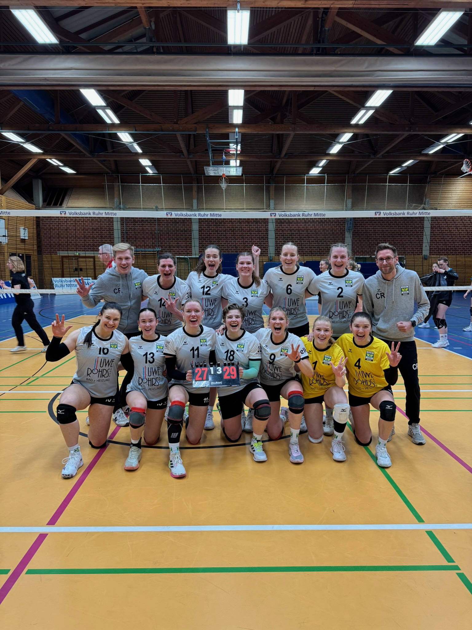Jetzt wollten wir natürlich alle Punkte mit nach Hause nehmen und den Sack zu machen, trotzdem schlichen sich wieder Fehler ein und es stand zwischenzeitlich 19:12 für die Gegnerinnen. Wir hatten also nichts zu verlieren und durch Mut im Aufschlag und gegnerische Fehler konnten wir uns wieder herankämpfen. Zum Satzende war es ein Kopf an Kopf Rennen mit insgesamt vier Satzbällen für Gladbeck. Wir konnten unsere Chance dann nutzen und den ersten Satzball zum 27:29 verwandeln.